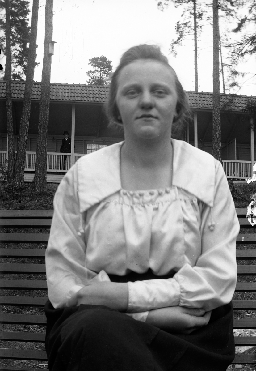 Lungkliniken i Eksjö. En kvinna med korslagda armar sitter på en bänk, i bakgrunden syns en träveranda.