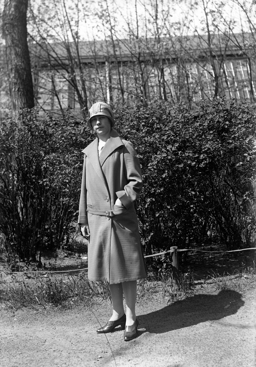 En kvinna klädd i kappa och hatt står på en väg framför en häck. I bakgrunden skymtar ett stort hus.
