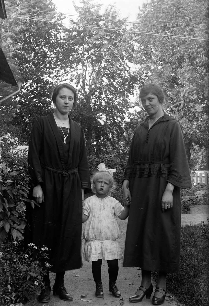 Två kvinnor med en liten flicka mellan sig står i en trädgård i kvarter Jägmästaren i Jönköping. I bakgrunden syns lövträd samt staket.
