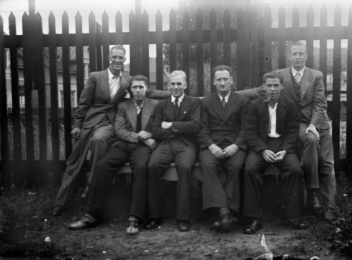 Sex män sitter på en bänk framför ett högt trästaket med byggnader bakom.