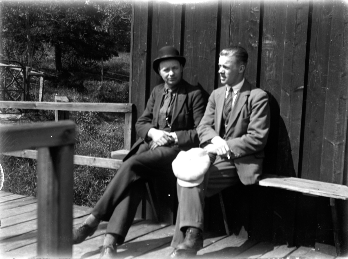 Två män sitter på en bänk vid en trävägg, i bakgrunden ängsmark och träd.
