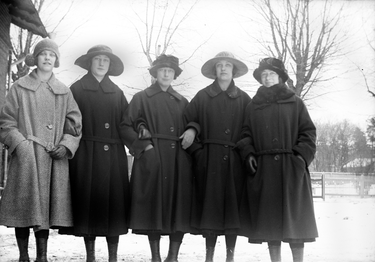 Fem unga kvinnor i kappa och hatt står bredvid ett hus, i bakgrunden syns kala träd och ett staket.
