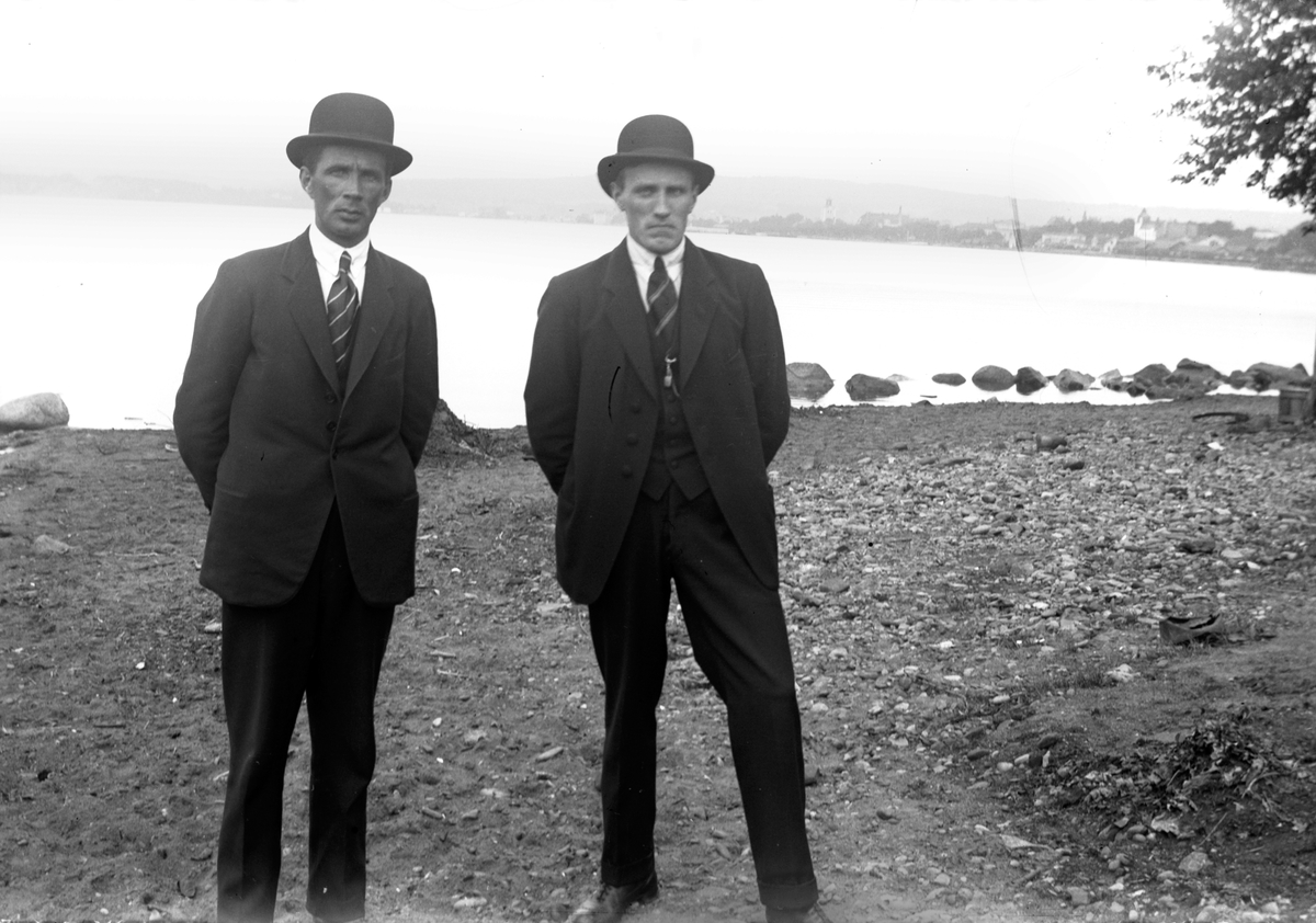 Två män, från vänster räknat(1)Karl Andersson, (2)Gustav Wredberg står vid Vättern, norr om båthusen vid Talavid med Jönköping i bakgrunden.