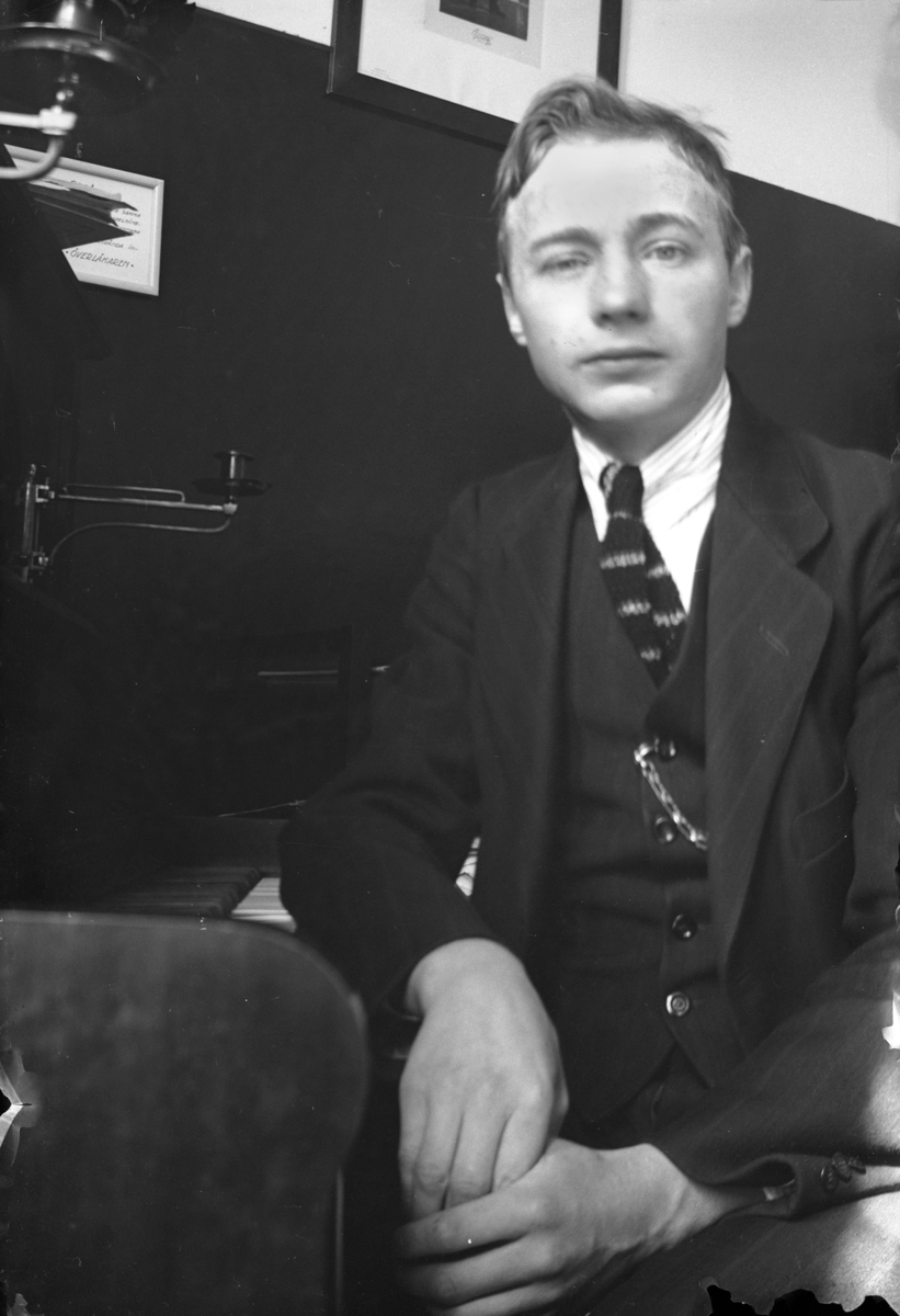 Porträtt av Gustav Andersson bredvid ett piano.