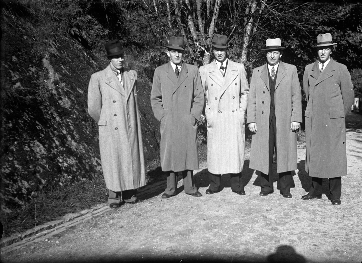 Fem män klädda i rock och hatt står på en väg, vid sidan syns en bergssluttning och träd.