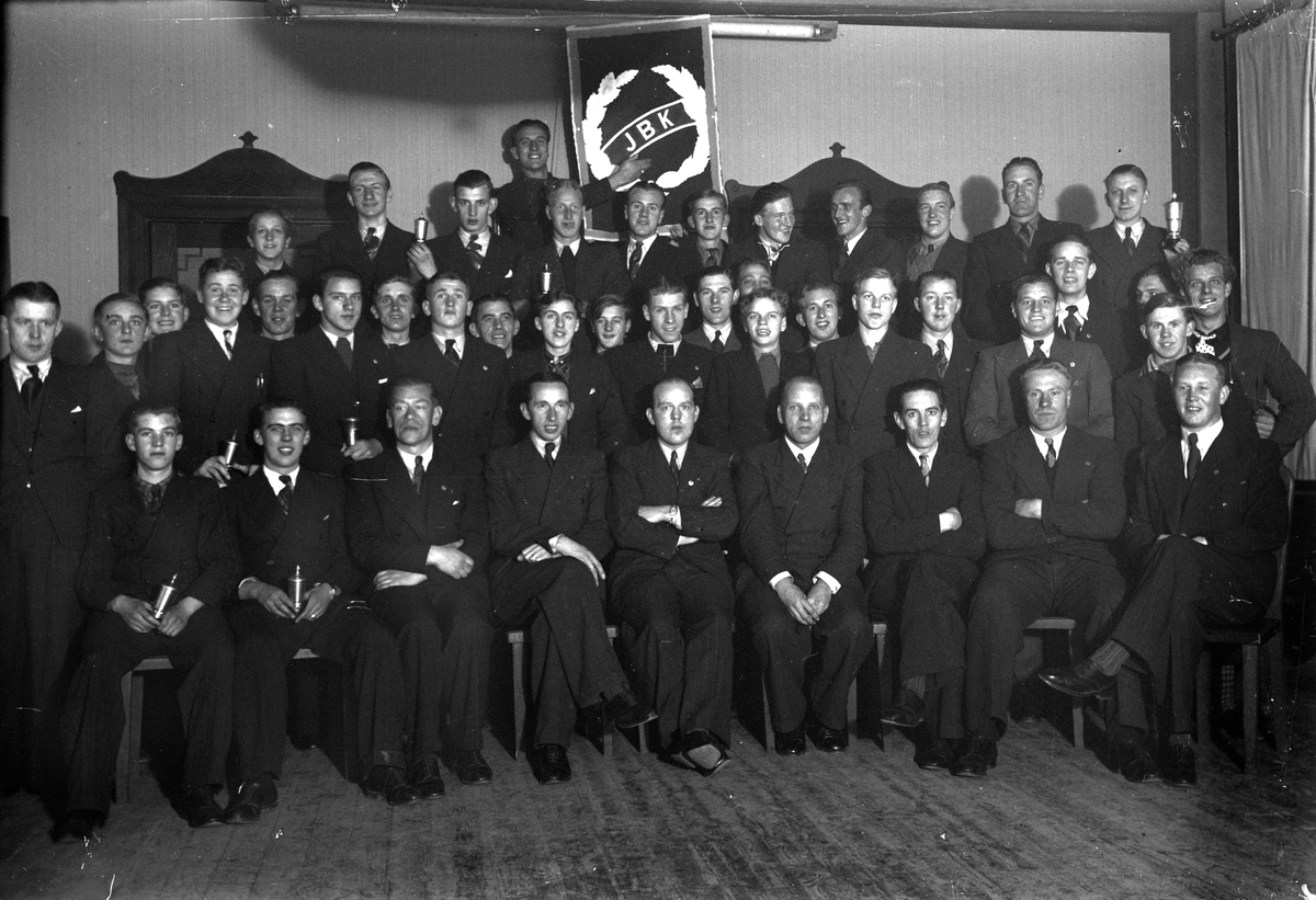 44 män och pojkar står eller sitter med en vägg som bakgrund. En man håller en tavla med motiv av en krans och bokstäverna JBK.