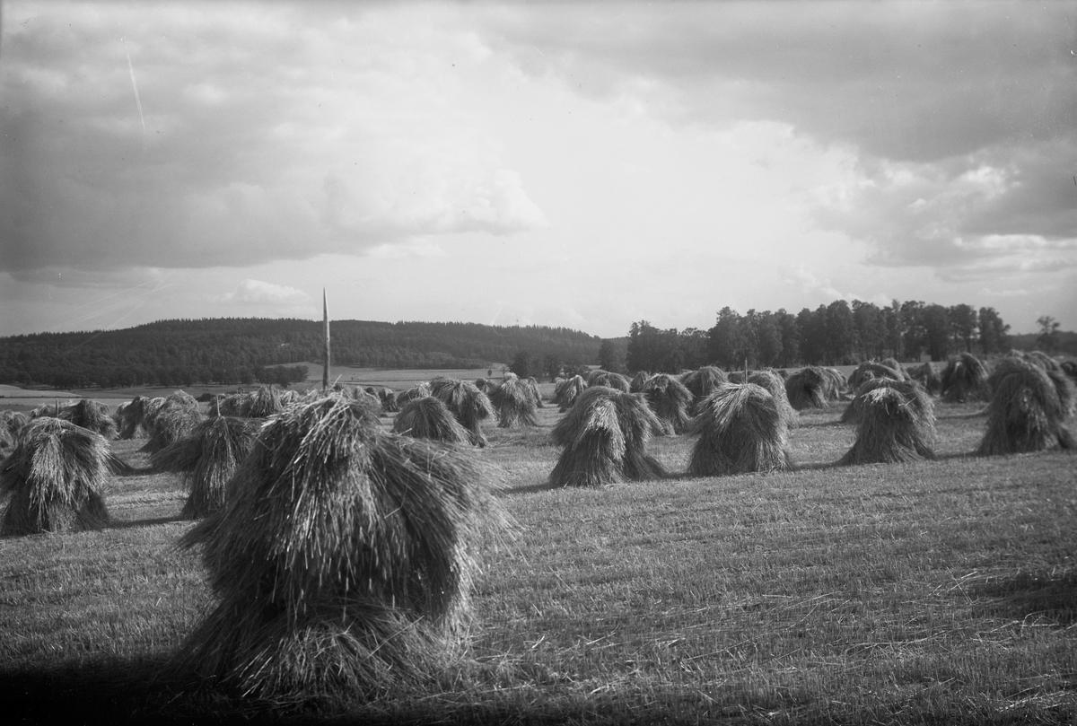 Ett fält med sädesskylar, i bakgrunden skog.