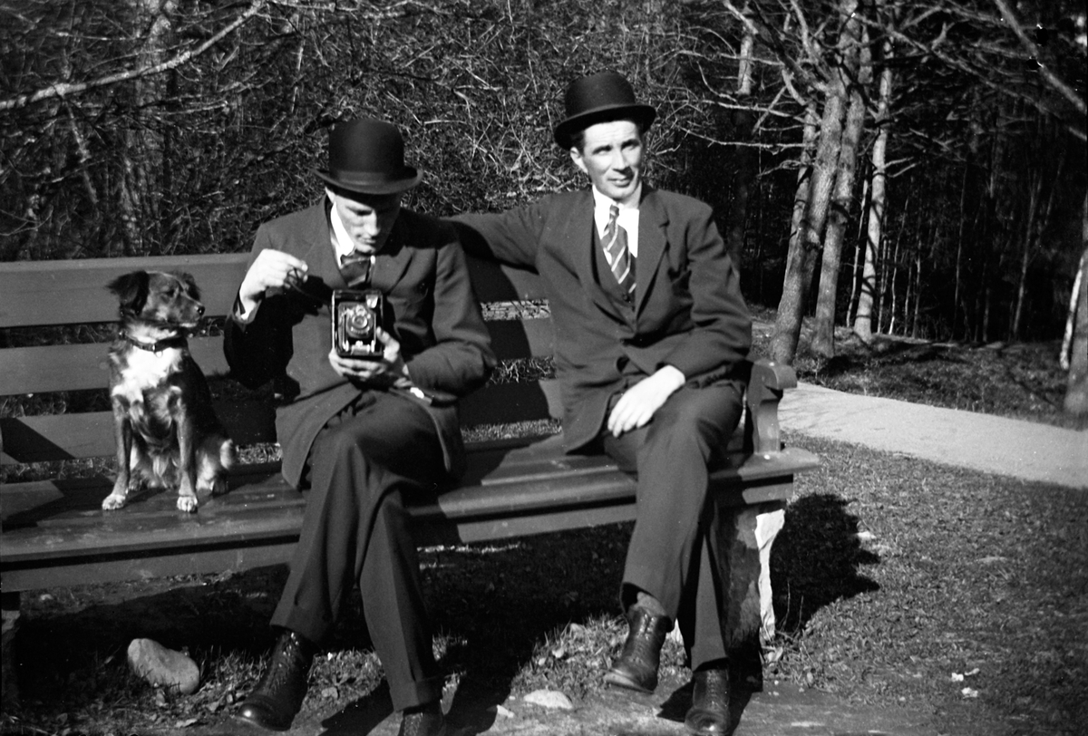 Två män och en hund sitter på en parkbänk. Den ene mannen håller en kamera i knät.