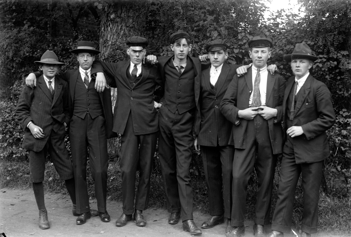 Sju äldre pojkar står uppställda för fotografering på en grusgång, framför träd och buskar.