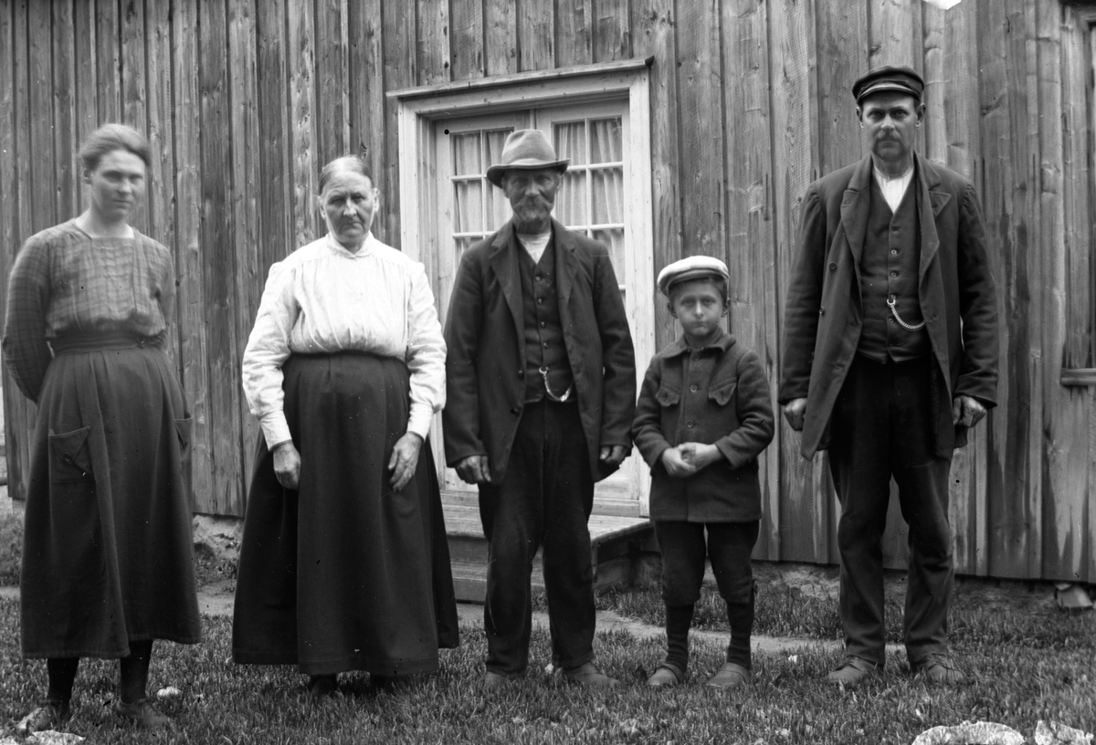 Ett äldre och ett yngre par med en liten pojke står framför ett trähus.