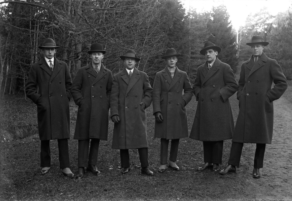 Sex män klädda i rock och hatt står uppställda på rad vid en väg i skogen.