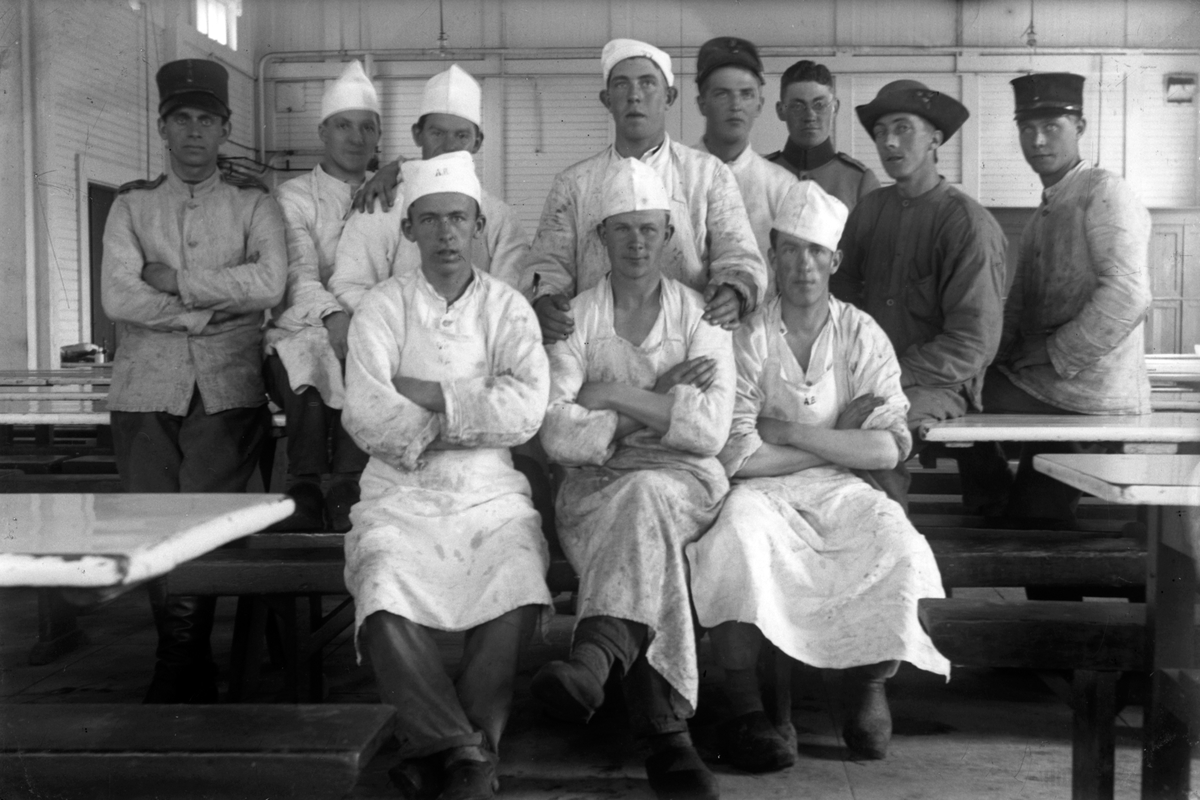 Fem män i uniform och sex i köksmundering står uppställda i matsalsmiljö.