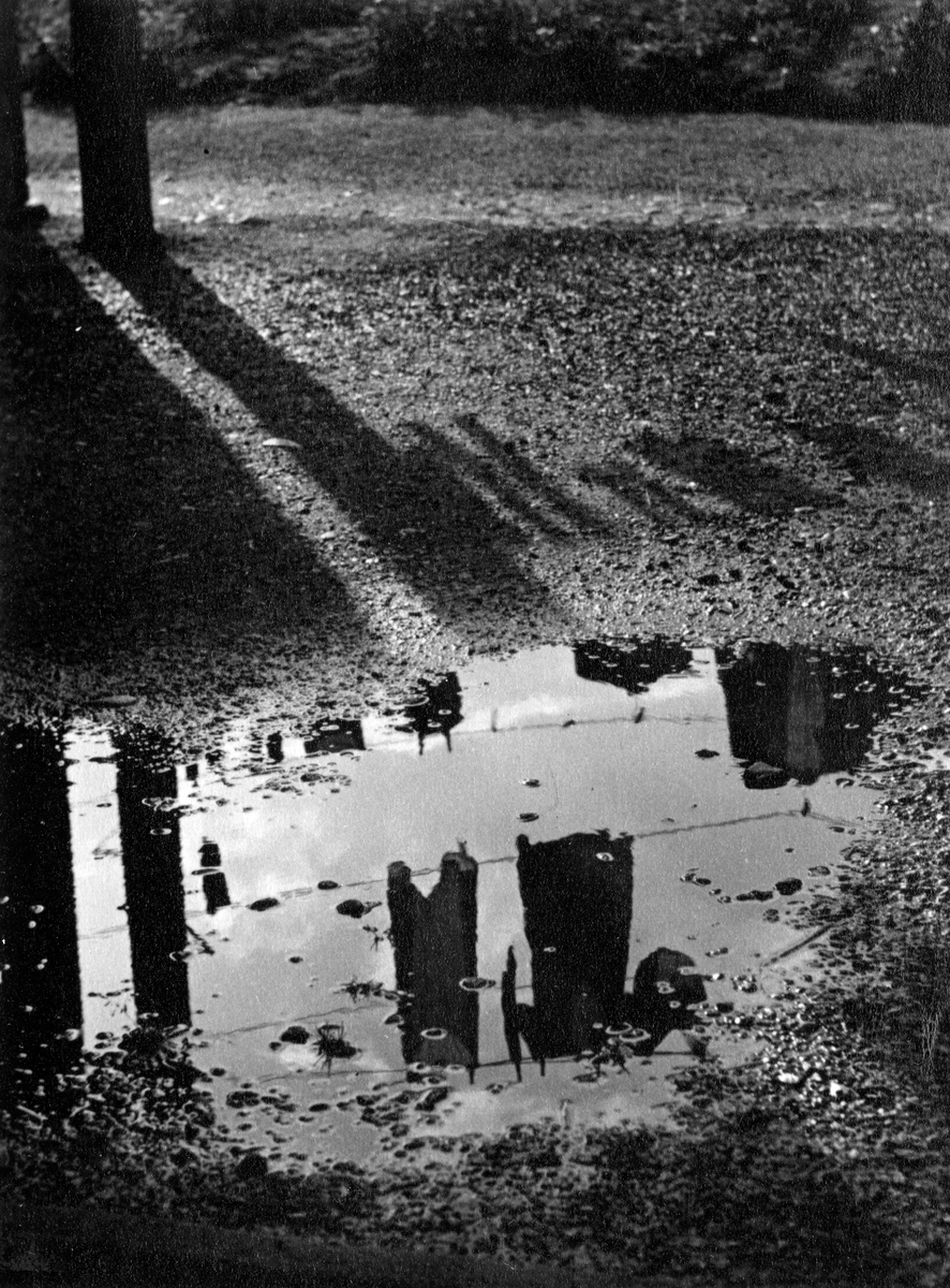 Tvätten är upphängd på ett klädstreck och speglar sig i en vattenpöl.