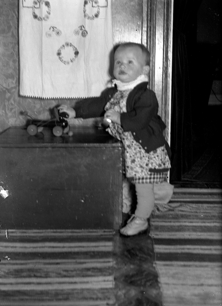 Ett litet barn står vid en låda och leker med en trähund. På golvet ligger vävda trasmattor och på väggen hänger en broderad paradhandduk.