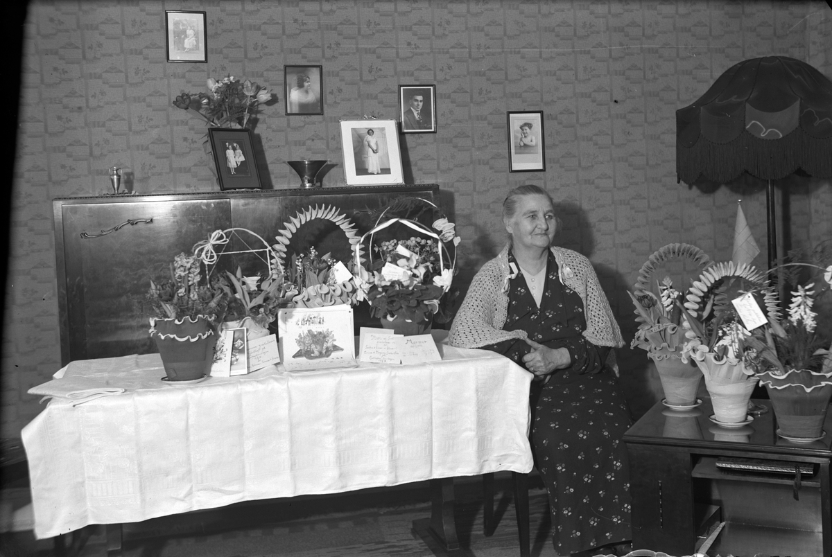 En dam sitter vid ett bord och har gratulerats på sin sjuttiofemårsdag med blommor och telegram.
