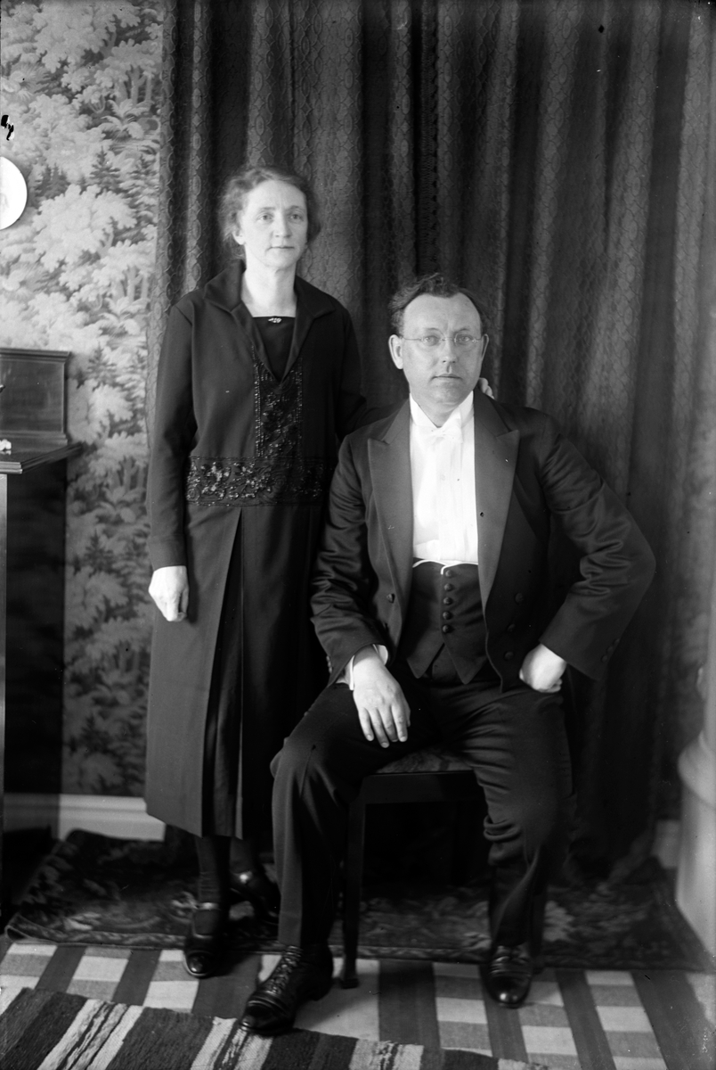 Framför ett draperi sitter en man på en stol och en kvinna står bredvid honom.