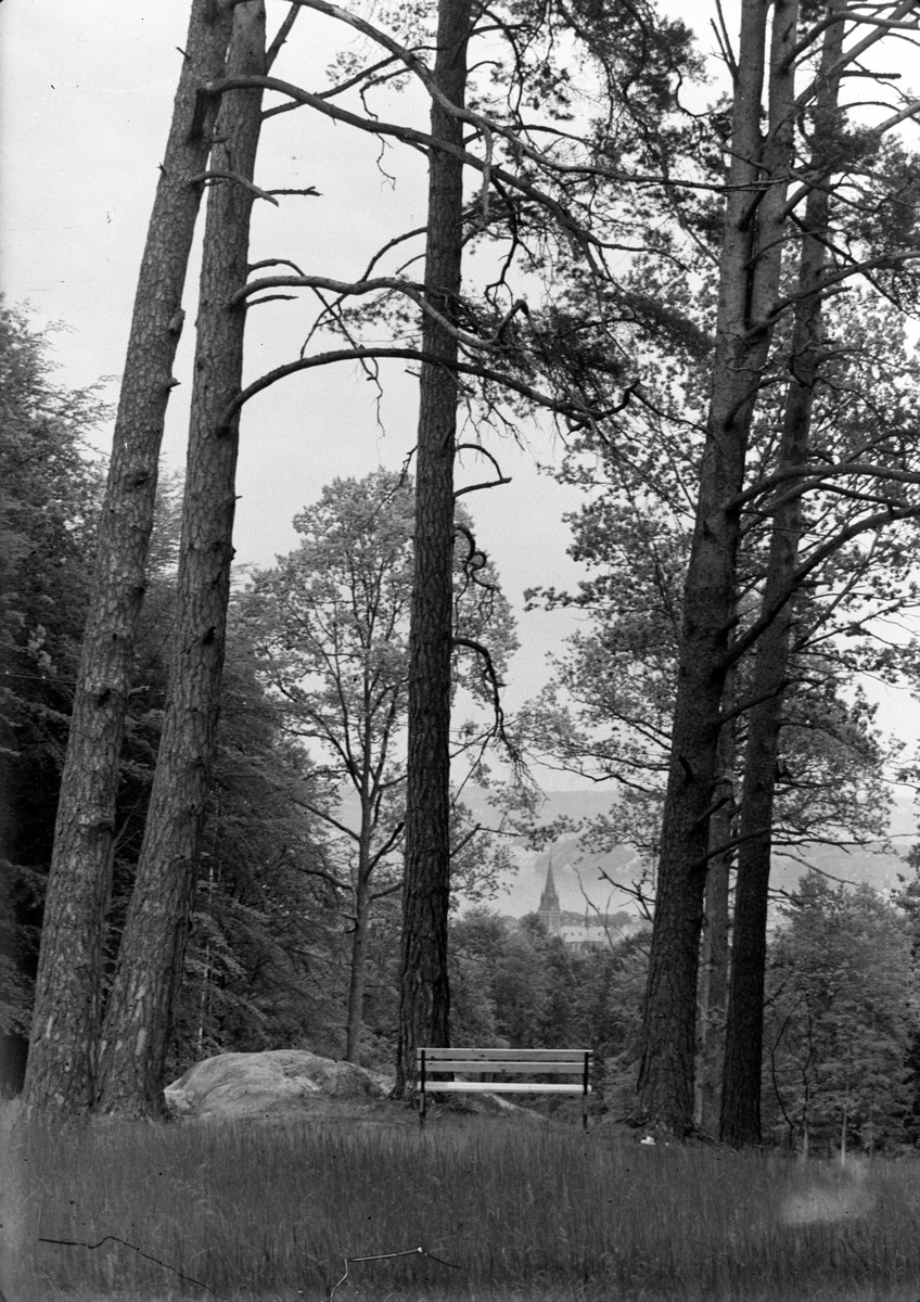 Jönköpings Stadspark med träd och parksoffa. Mellan träden skymtar Sofiakyrkan och Vättern från sydväst.
