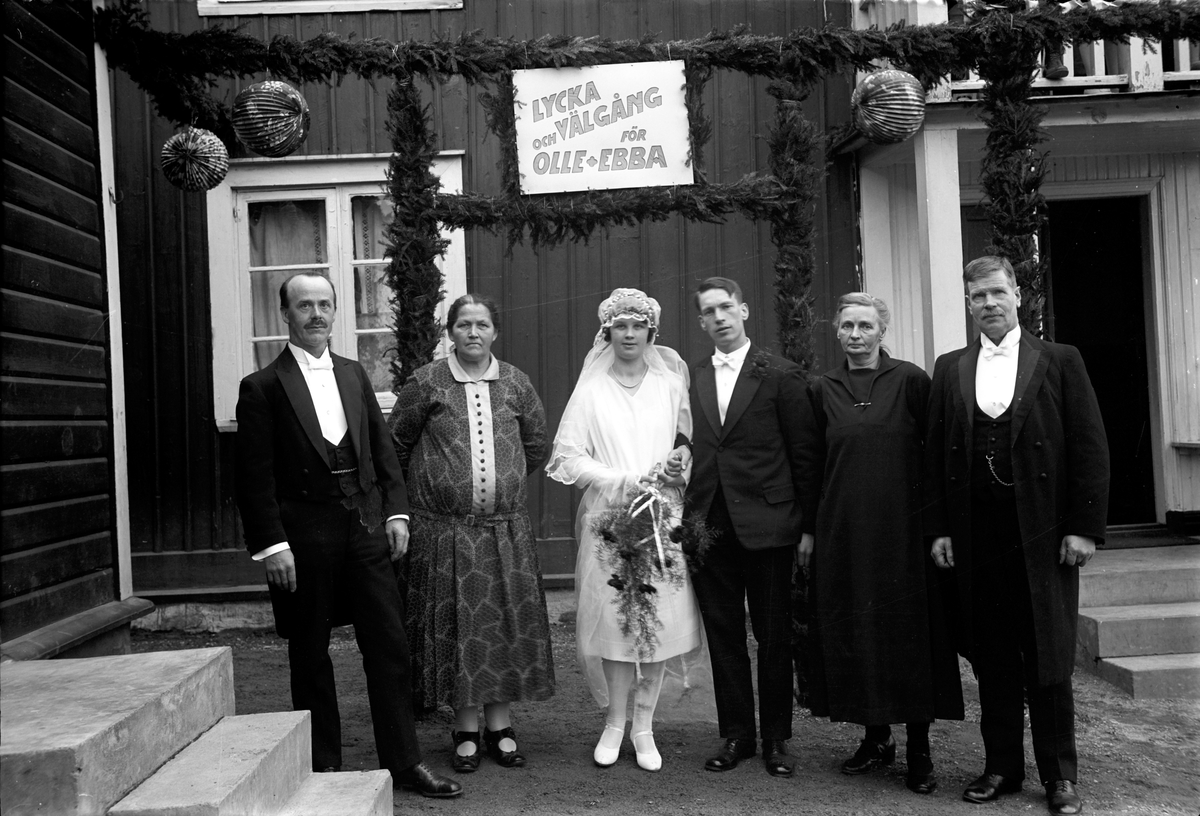 Ett brudpar med föräldrarna uppställda för fotografering av Gustav Andersson, Jönköping, framför en granrisklädd veranda. Där hänger också papperslyktor och en skylt med texten: Lycka och välgång för Olle + Ebba.