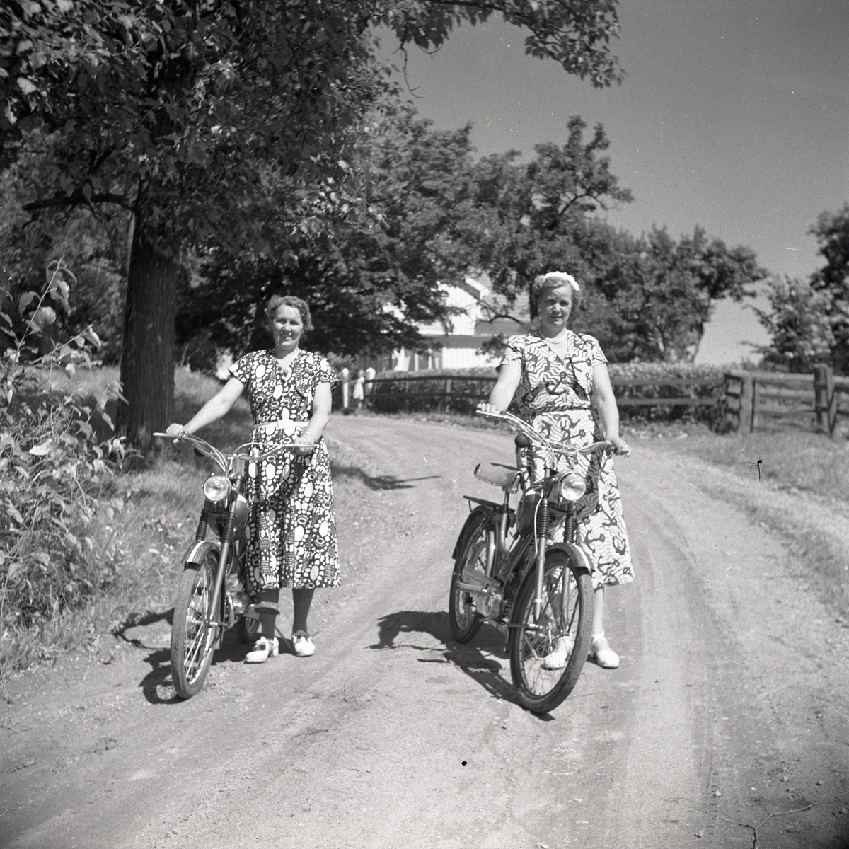 Märta Blom och Ellen Andersson med mopeder av märket Monark. I närheten av Kyrkans sommarhem i Ederskvarna