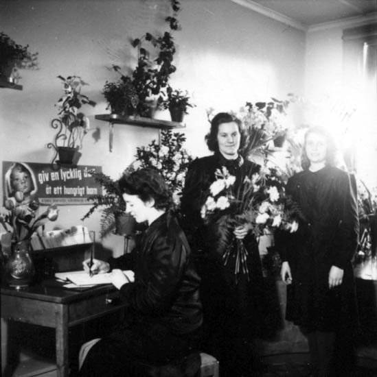 Maj Sjöberg till vänster med personal i blomsterhandeln på Barnarpsgatan i Jönköping. Flickan till höger är Solvieg Johansson, gift Lanz.
