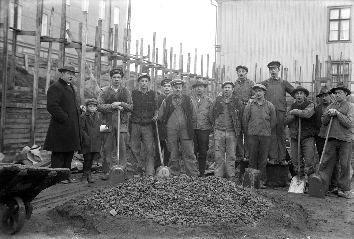 Arbetare med spadar i händerna står vid en hög med sten och grus. Till vänster ses en man med finkläder och bredvid sig har han en ung pojke.