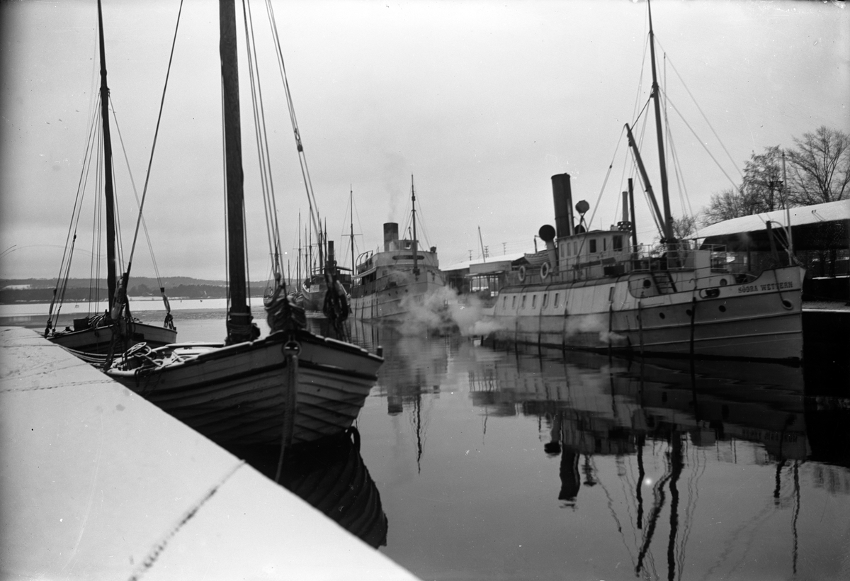 Båten "Södra Wettern" i Jönköpings hamn tillsammans med andra båtar, "Visingsborg-Visingsö" och fiskebåten "Kronan".