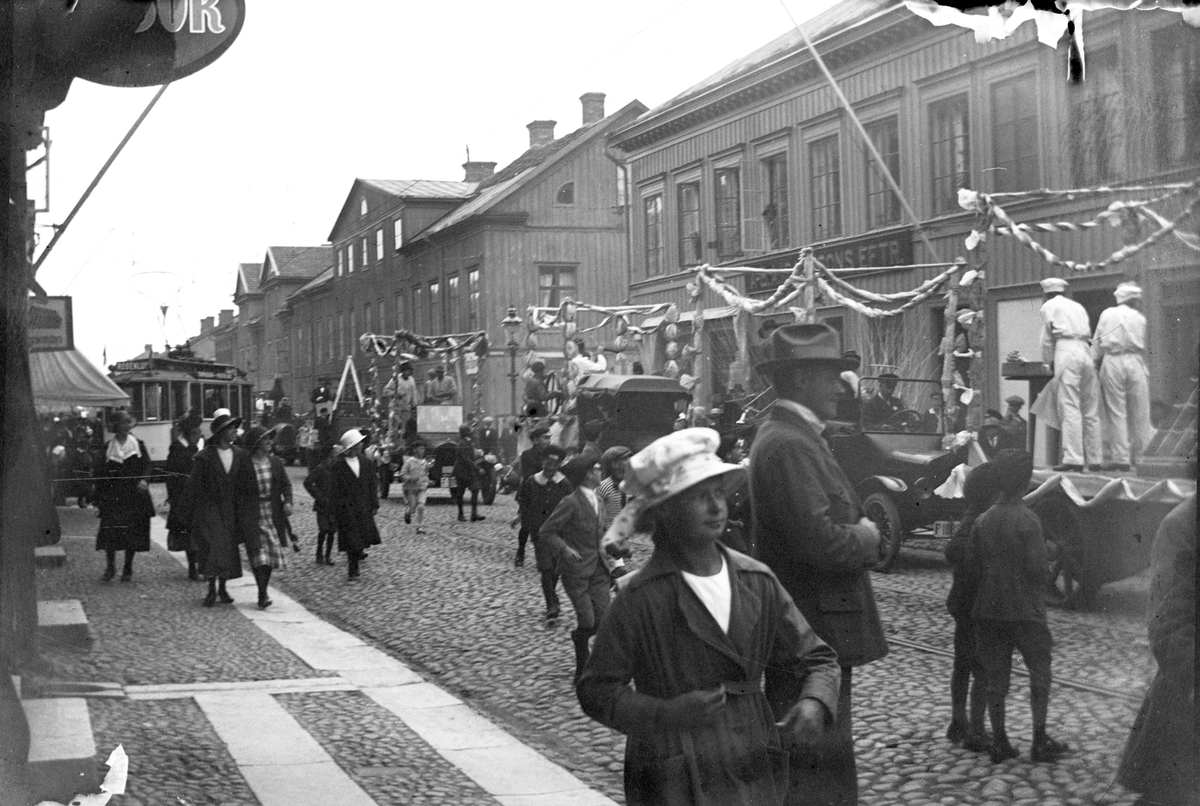 En karavan på Barnarpsgatan i Jönköping går ett karnevalståg med bilar. Människor följer med vid sidan och en spårvagn som svänger in på en tvärgatan skymtar i bakgrunden.