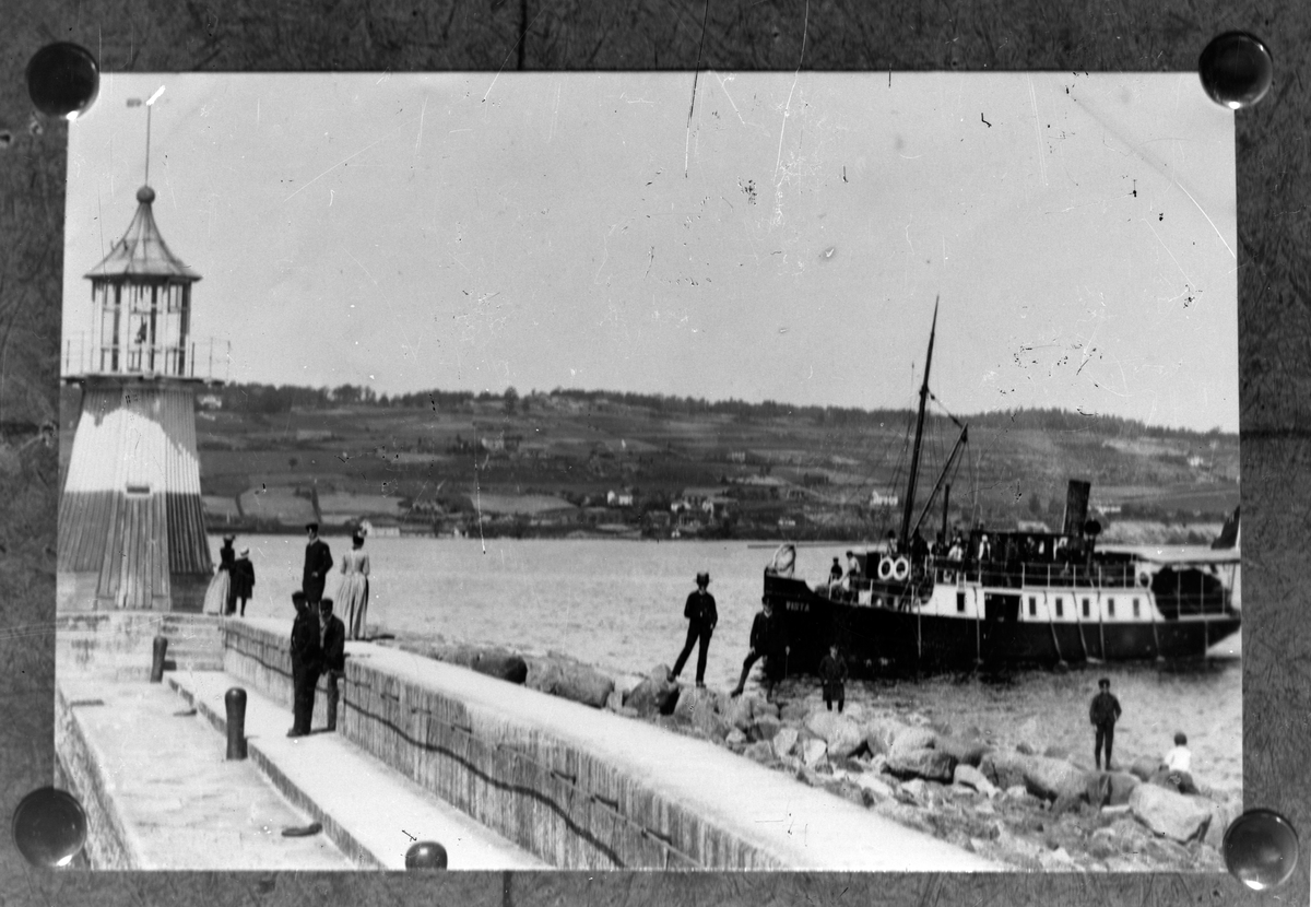Båten "Vista" vid hamnen i Jönköping. I bakgrunden syns området Bymarken.