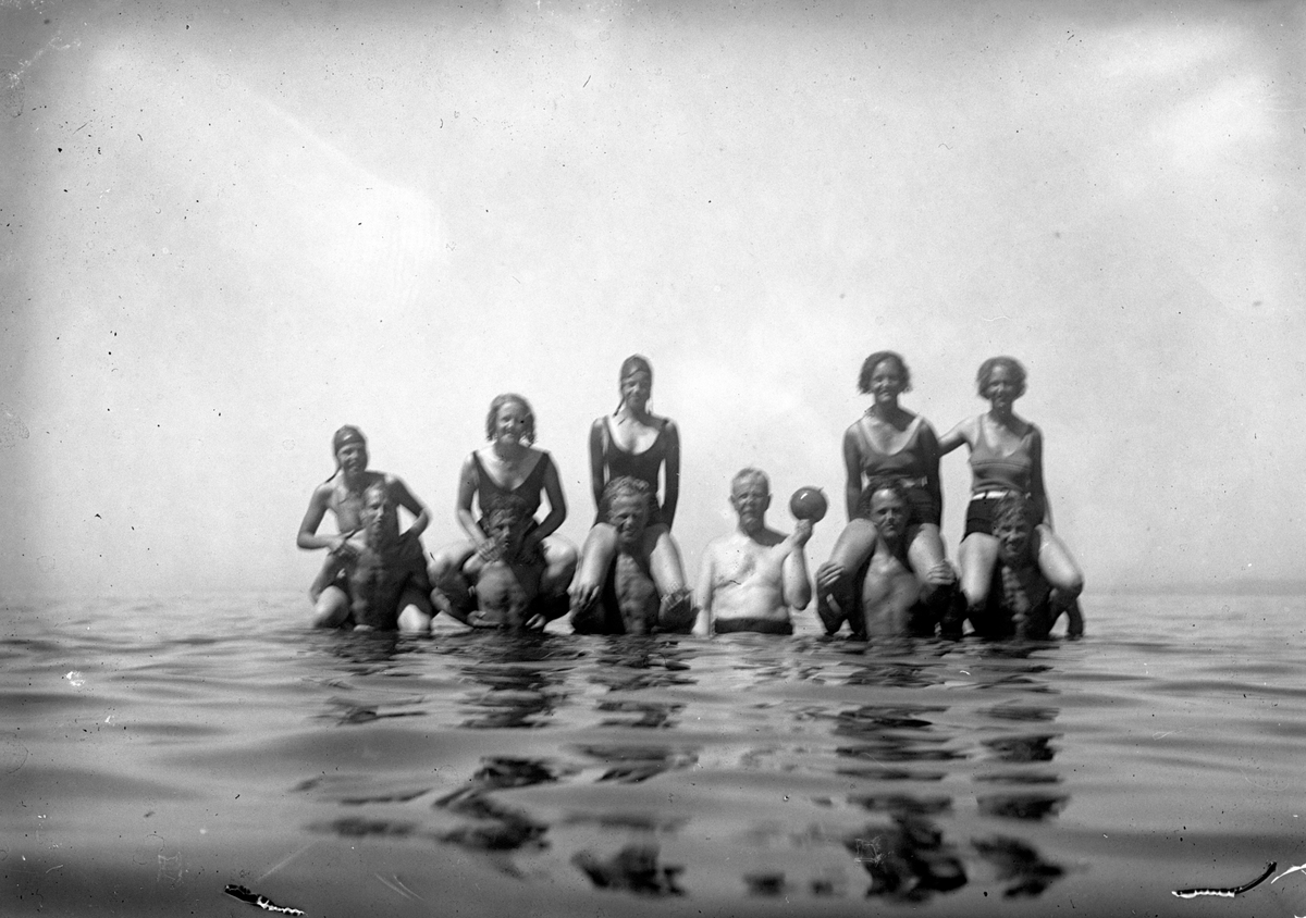 Några ungdomar badar i sjön, en man håller i en boll för vattenlek.