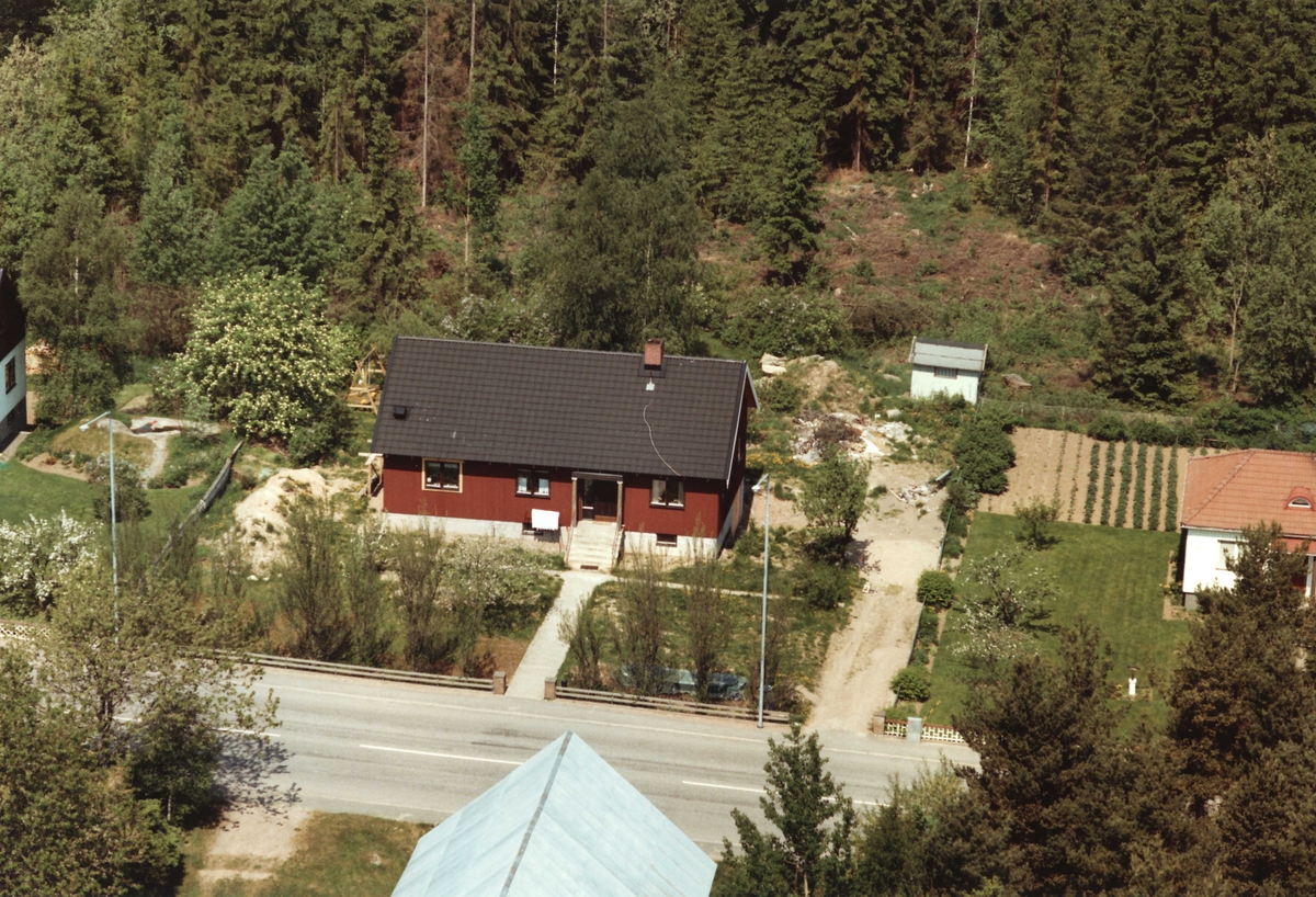 Flygfoto över fastighet på Vetlandavägen 41 i Landsbro. Vetlanda kommun.