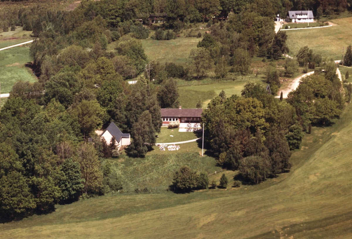 Flygfoto över fastigheter, närmast i bild Lidnäs kapell och Lidnäs lägergård, Näsbyholm. Fastigheten längst bak i bilden Ekebo 1, Näsbyholm, Värnamo kommun.