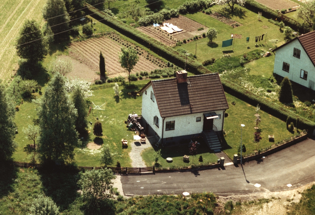 Flygfoto över fastighet på Gärdesvägen 4 i Myresjö, Vetlanda kommun.