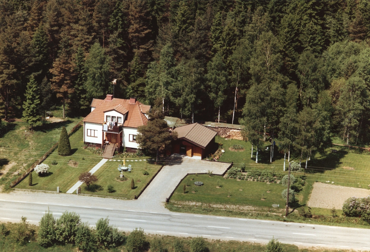 Flygfoto över fastighet på Vetlandavägen 17 i Myresjö, Vetlanda kommun.