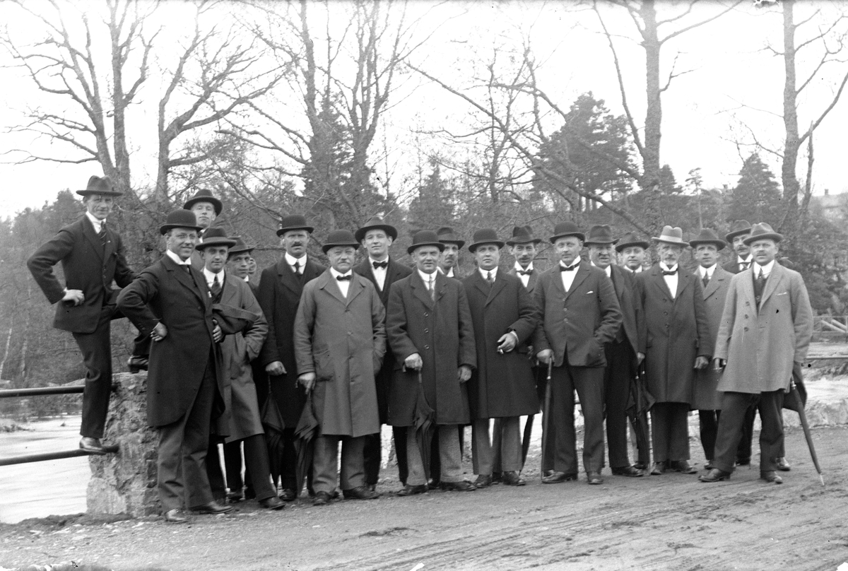 Nitton män i rock och hatt, några med paraply i handen, står på en väg vid ett räcke med skog i bakgrunden.