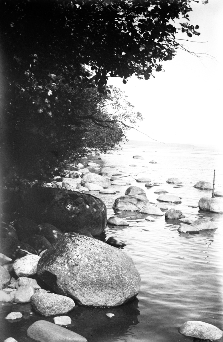 En strandkant med stenar och överhängande träd.