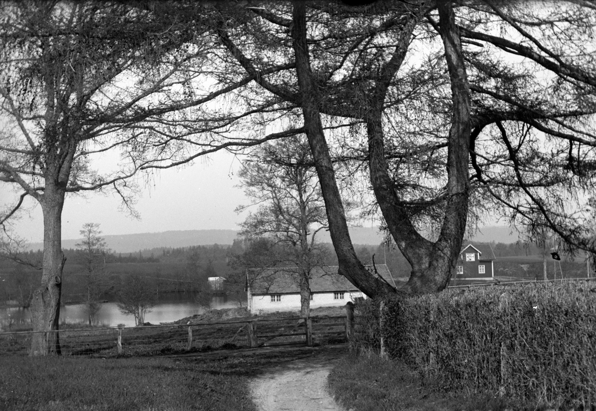 Ett hus ligger vid en liten sjö, en väg går förbi en häck och stora träd.