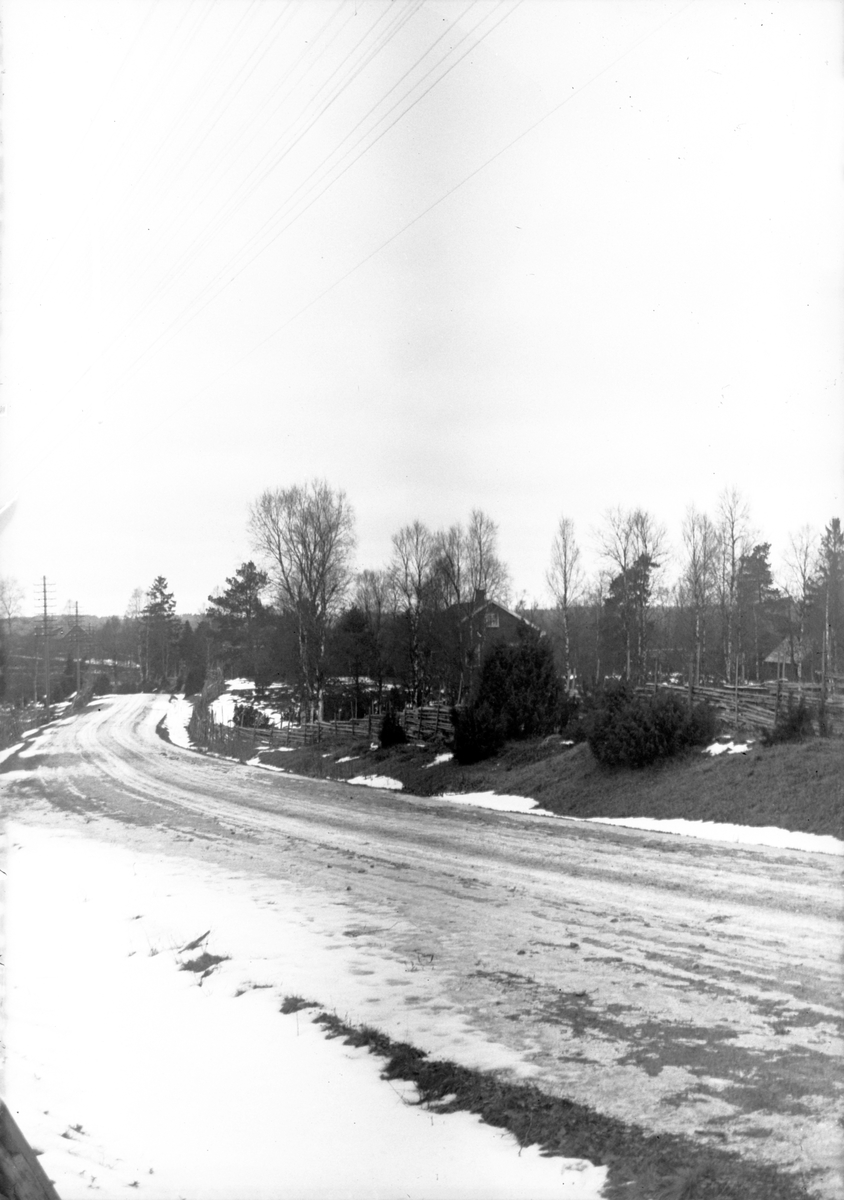 Vid landsvägen ligger snön kvar i diket och vägen är isig. Till höger ett hus med gärdesgårds runt.