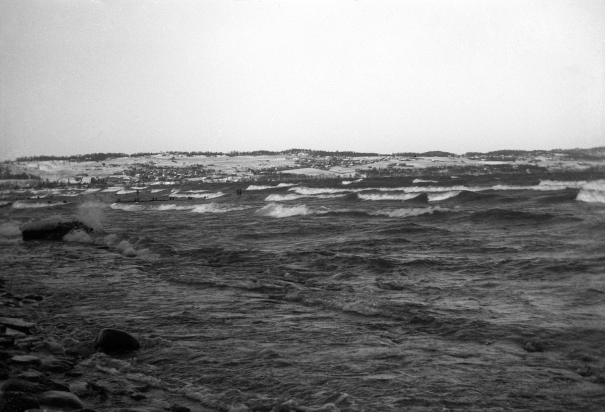 Det stormar och vågorna går höga på Vättern vid Jönköping. I bakgrunden syns höjderna mot väster.