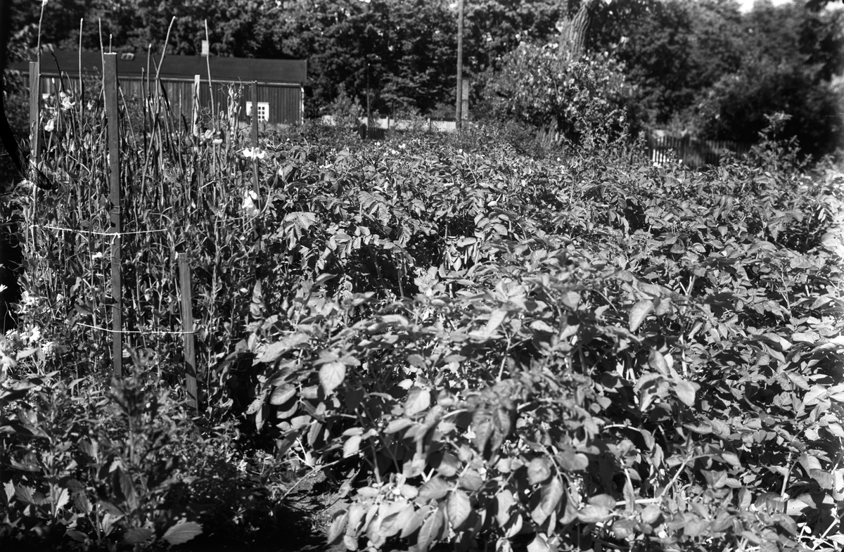 I trädgården finns ett stort potatisland och till höger växer luktärtor och prästkragar.