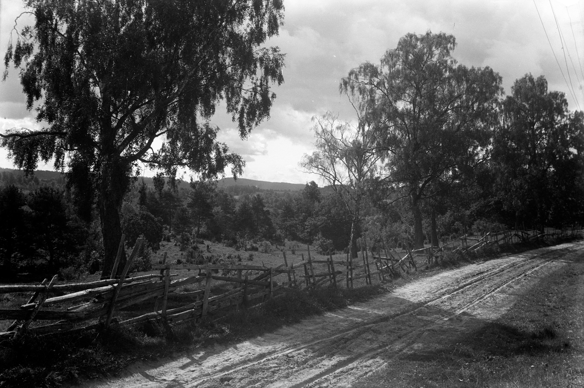 En grusväg och ett staket följs åt genom trädbevuxna hagar.