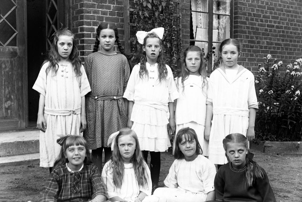 Nio flickor uppställda för fotografering framför ett tegelhus.