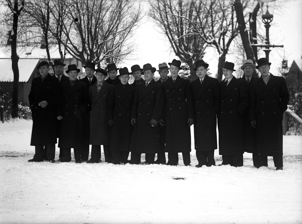 Män i rock och hatt står uppställda på rad på en snöig väg.