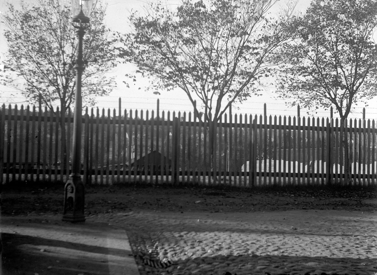 Troligen slutet på Lazarettsgatan i väster i Jönköping med Vestra Tändsticksbolagets mark bakom staketet. I bakgrunden skymtar klockstapeln i stadsparken.
