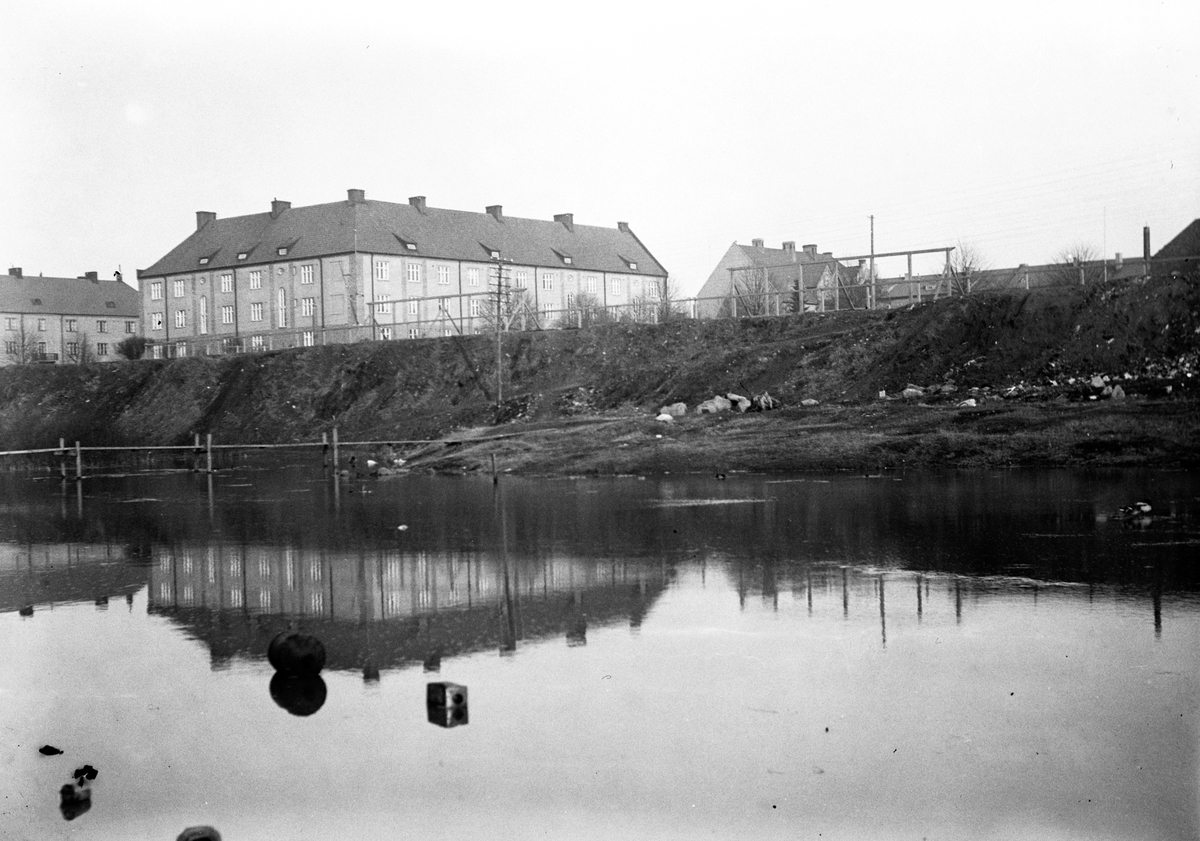 Bostadshus vid Gröna gatan på Torpaområdet i Jönköping. Huset ligger i hörnet av Gröna gatan och Veragatan. I förgrunden Friaredalen med Junebäcken, som här var en mindre sjö på 1950-talet.