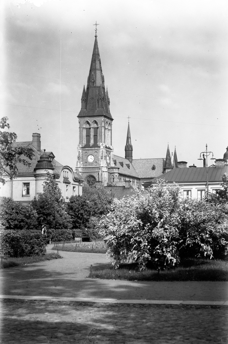 En del av parken vid Västra torget i Jönköping. I bakgrunden syns Sofiakyrkan.