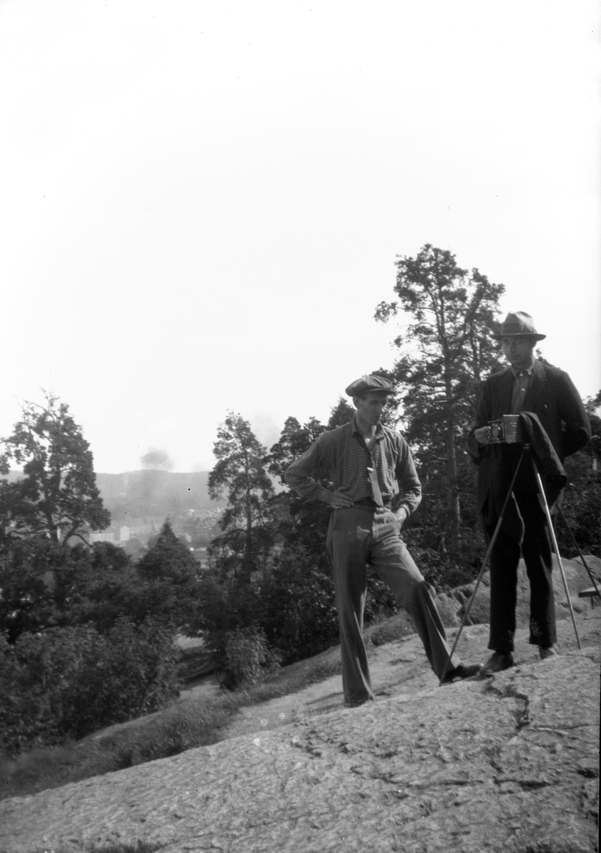 Fotograf Gustav Andersson med sin kamera tillsammans med en annan man på berget i Jönköpings stadspark.