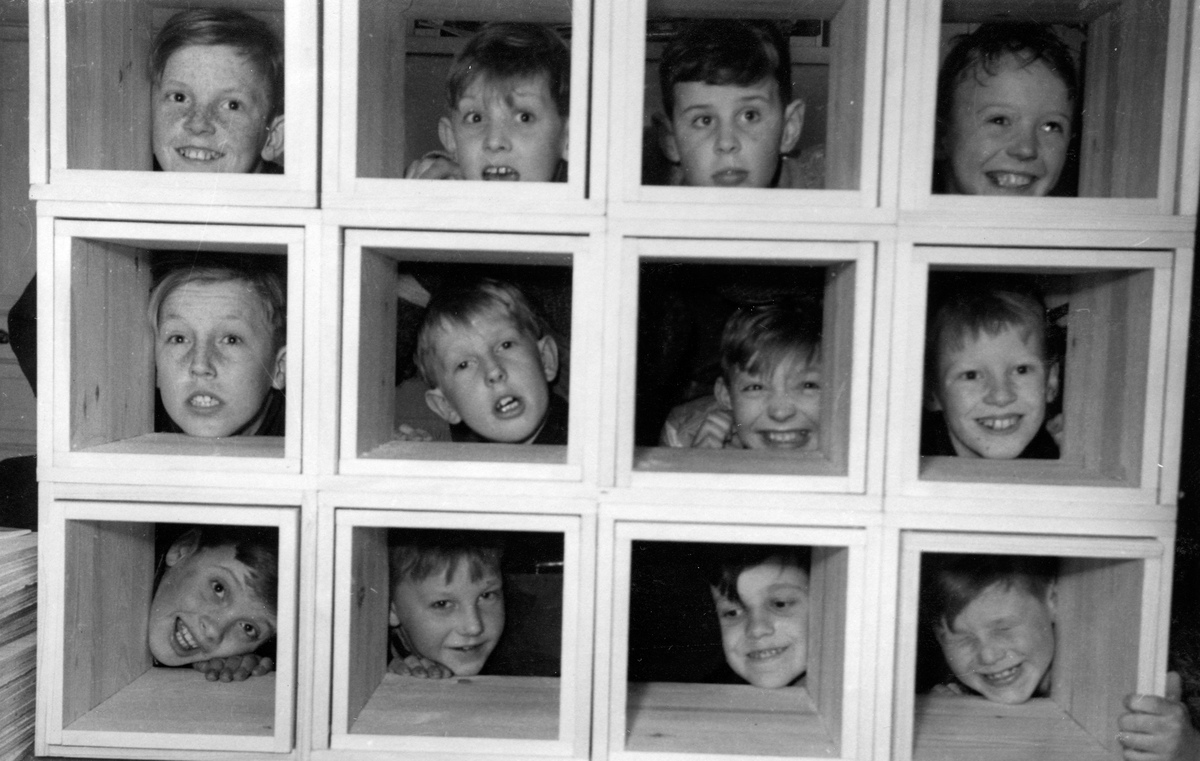 Pojkar tittar fram genom uppbyggda lådor på Vinterstugan i Jönköping. Det var bolaget som ägde huset och det fanns två tanter som höll vakt.