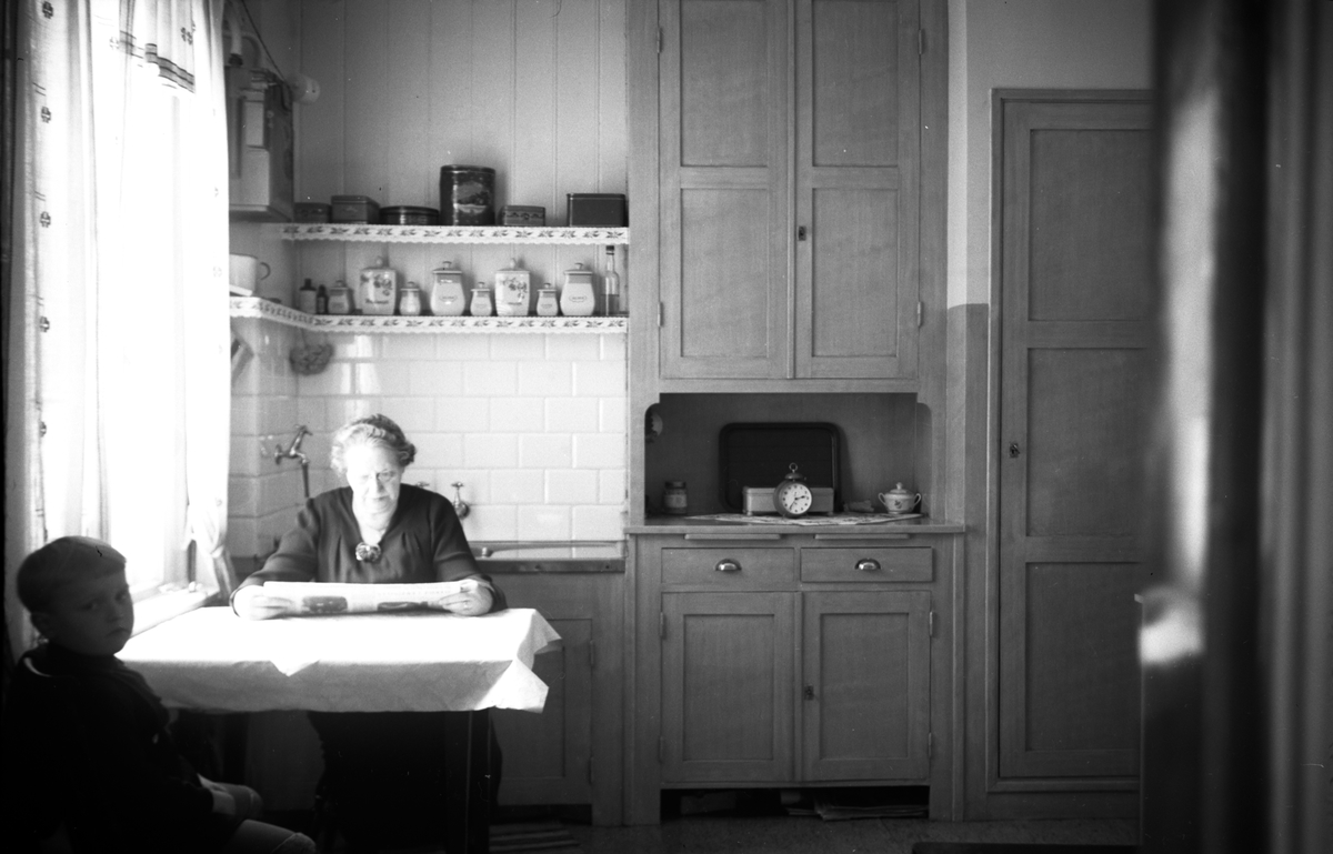 Interiör från ett kök i en lägenhet i Jönköping. En pojke och en kvinna som läser tidningen sitter vid köksbordet.