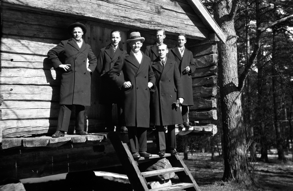 Sex män i Vitsippsklubben står på trappan till Stolpboden i Jönköpings Stadspark.