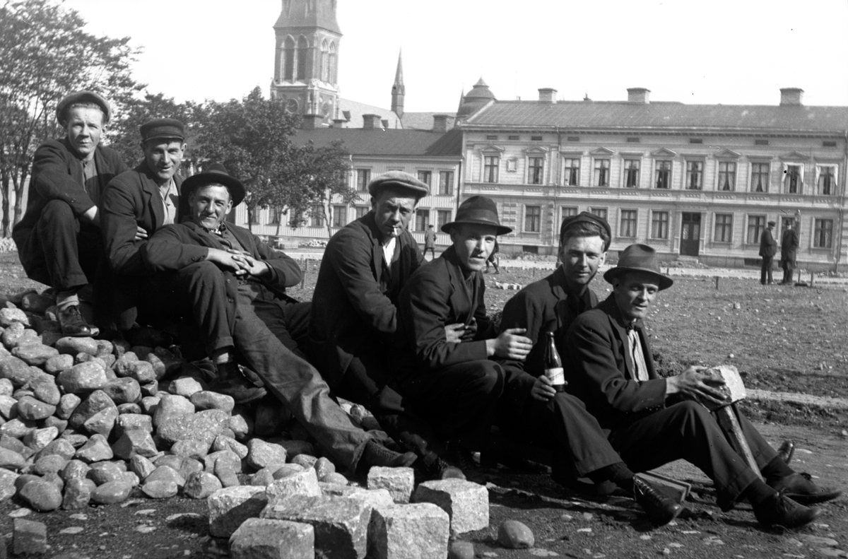 Sju män sitter på gatstenshög på Västra torget i Jönköping som håller på att iordningsställas. Från vänster Erik Nilsson, Gunnar "Moije", Harald Worell, George Nilsson, Artur Johansson, Gustav Svensson, Bertil Levien.